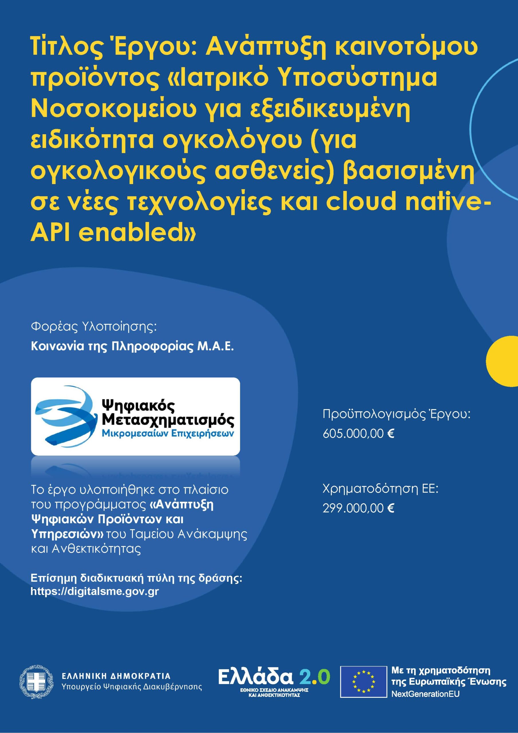 H εταιρεία ABK SOLUTIONS Α.Ε. υλοποιεί το Έργο «Ανάπτυξη καινοτόμου προϊόντος «Ιατρικό Υποσύστημα Νοσοκομείου για εξειδικευμένη ειδικότητα ογκολόγου (για ογκολογικούς ασθενείς) βασισμένη σε νέες τεχνολογίες και cloud native-API enabled» που θα οδηγήσει στη δημιουργία ενός εξειδικευμένου Πληροφοριακού Συστήματος με στόχο να διατεθεί στο Ελληνικό Εθνικό Σύστημα Υγείας. Το Σύστημα θα διευκολύνει την τεκμηρίωση ιατρικών αποφάσεων των ογκολόγων βάσει θεραπευτικών πρωτοκόλλων, την καταγραφή και οργάνωση εξατομικευμένων δεδομένων και την αξιοποίηση βιβλιογραφικών στοιχείων. Επιπλέον, θα προσφέρει δυνατότητες για διαχείριση μεγάλου όγκου δεδομένων και διαρκές monitoring δεικτών σχετικά με τα αποτελέσματα και τις παρενέργειες των θεραπειών, ανταποκρινόμενο στις απαιτήσεις της ψηφιακής εποχής. Το έργο υλοποιείται στο πλαίσιο του προγράμματος «Ανάπτυξη Ψηφιακών Προϊόντων και Υπηρεσιών» του Εθνικού Σχεδίου Ανάκαμψης και Ανθεκτικότητας «Ελλάδα2.0» με τη χρηματοδότηση της Ευρωπαϊκής Ένωσης-NextGenerationEU. H επίσημη διαδικτυακή πύλη της δράσης: https://digitalsme.gov.gr.